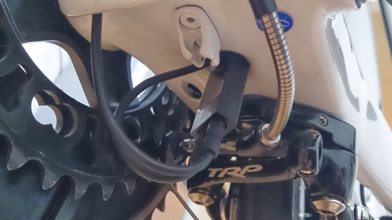 最難関、ジャンクションAからBB下までケーブルを通します。 Di2ケーブルはアウターのように剛性が高くないので、内部の波打ったカーボンフレームの中を素直に通ってくれません。 そこで、アウターそのものをガイドとしてDi2ケーブルとセロテープでくくりつけ、中を通していきます。ですが、トップチューブの小さい穴からではBB下までワイヤーを通すのは神様でもない限り不可能です。