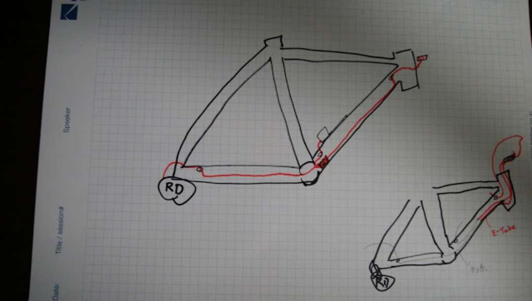 勢いだけで穴開けして失敗したくないので、市販の Di2 モデルがどこに穴を開けているか観察しながら黒マジックでポイントを決定。