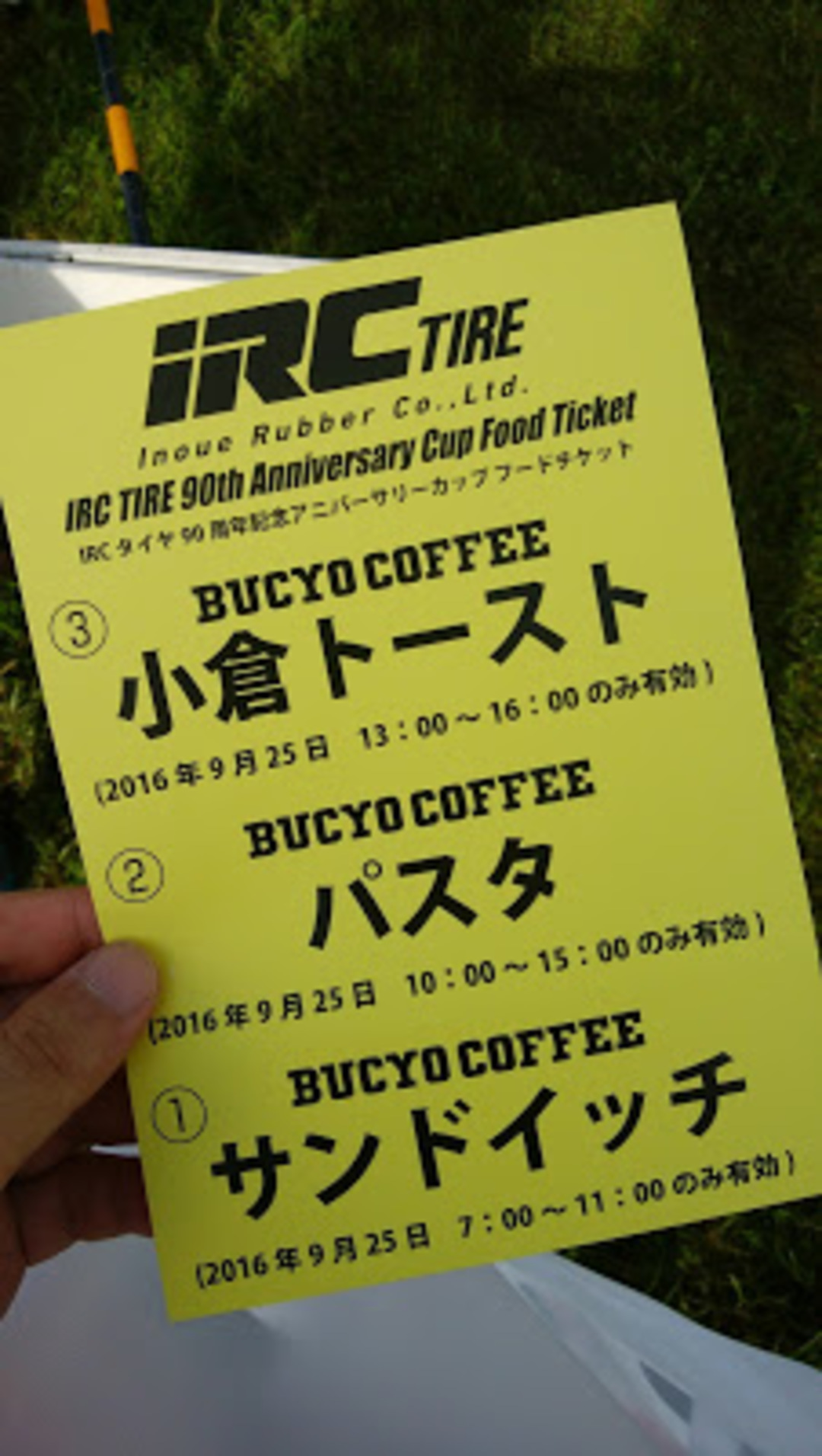 今回の東海シクロクロスは IRC タイヤの 90 周年記念ということで、エントリー費は据え置きで「速乾 T シャツ」「2 食+おやつ提供」「ドリンク飲み放題」という太っ腹っぶり。