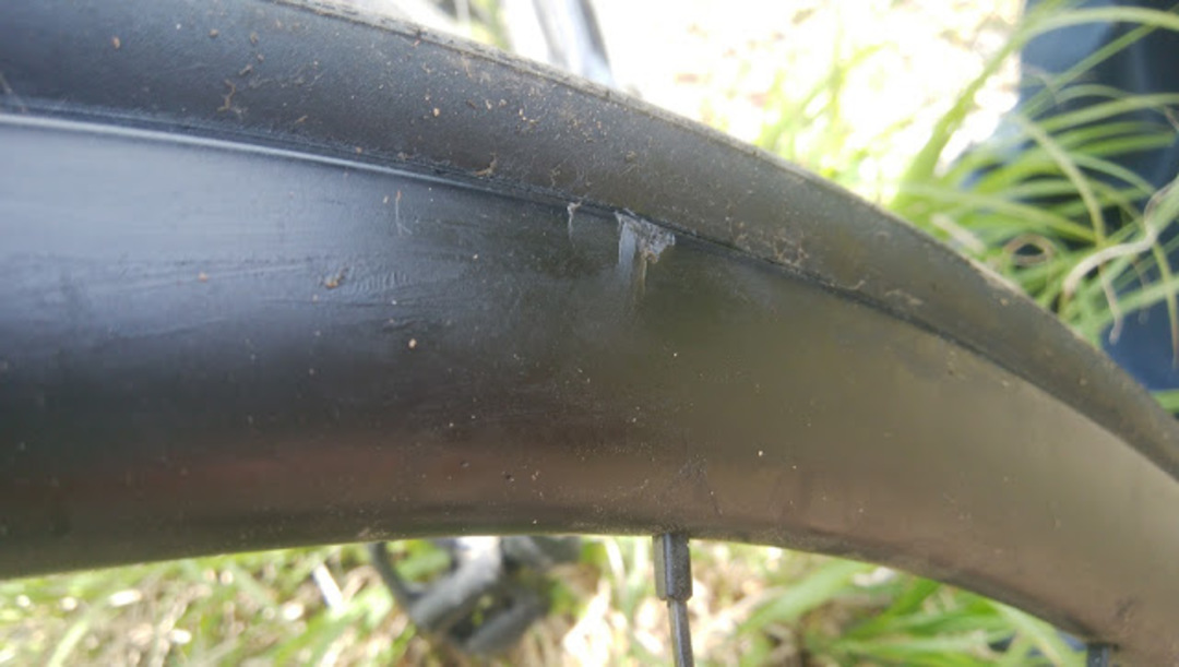 完全に膨らんでいるのでリムブレーキなら廃棄せざるを得ないところだけれどもディスクブレーキならタイヤさえ保持できればどうとでもなるというメリットを発見した。