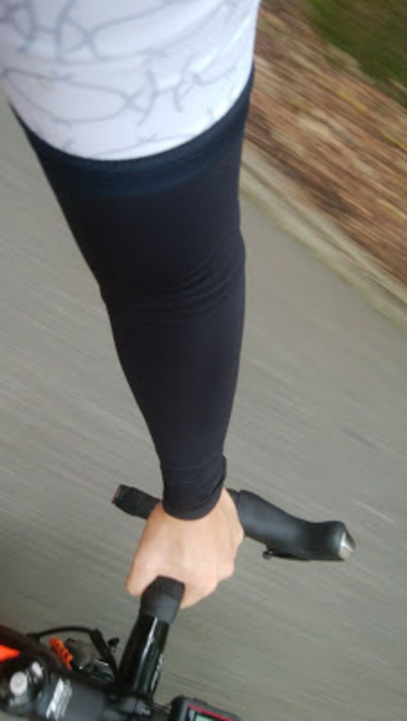 女性サイクリストはよく夏用アームカバーを使っているので、それを採用を検討したところ、自分の場合は腕が太く、締めつけ感がかなり不快なのでボツとなりました。