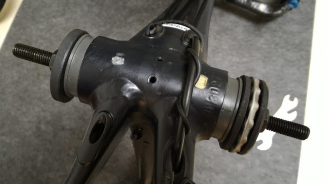 この挿入時だが、フィキシングボルトやバンジョーが付いているとフレームの穴を通ることができない。つまり外したブレーキについていた ブレーキホースの再利用は不可能 だった。