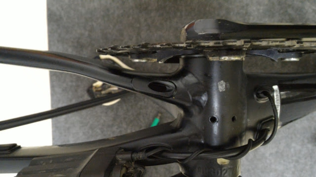また、Di2の配線にも癖がある。昔ながらのチェーンステー下外装マウントがあるバイクなのだが、左側はオイルラインの通る道でもあり、Di2ケーブルとブレーキホースを同時に通すほどの穴は存在しないので、なんとかする必要があった。