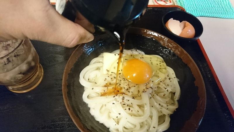 バターと溶き卵で釜玉うどんを頂くというシンプルと言えばシンプルな一品なのだが、超粗挽きの黒胡椒がかけたことでさながらカルボナーラの如き風味を生み出す釜玉うどん界に一石を投じたメニュー。トドメの特性出汁醤油が完璧な調和を作り出す。400円台でこの味がいただけるのだから香川はおそろしい。