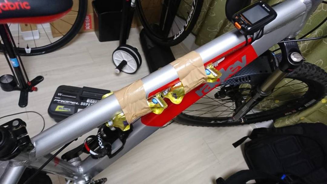 ステムバッグの代償に、ただでさえ少ないステム上のスペースが無くなってしまったため、サイコンはトップチューブ上に移植された。 その分トップチューブに貼り付けられるジェルの量が減ってしまったが仕方がない。