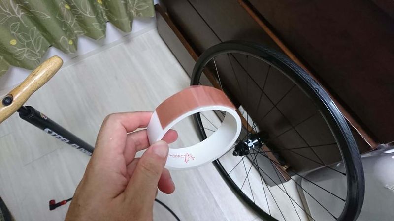 ホイールの中心にフンドシの縫い目を落とす溝があるので、そこも含めてしっかり密着させる。25mm幅のリムに25mm幅のテープなので本当にギリギリ。ついでに長さもギリギリ。
