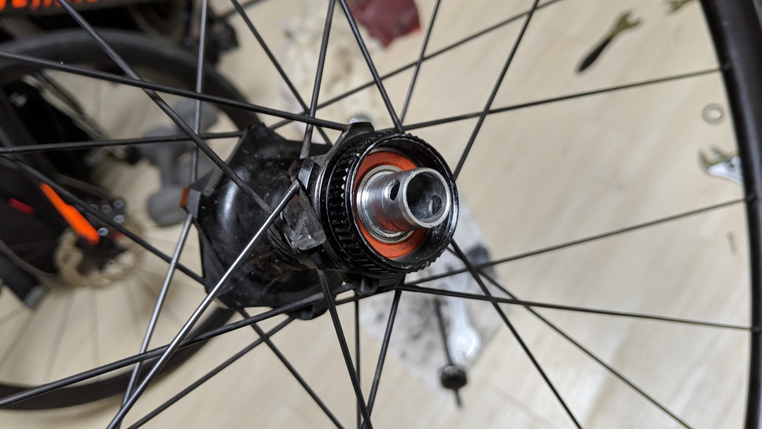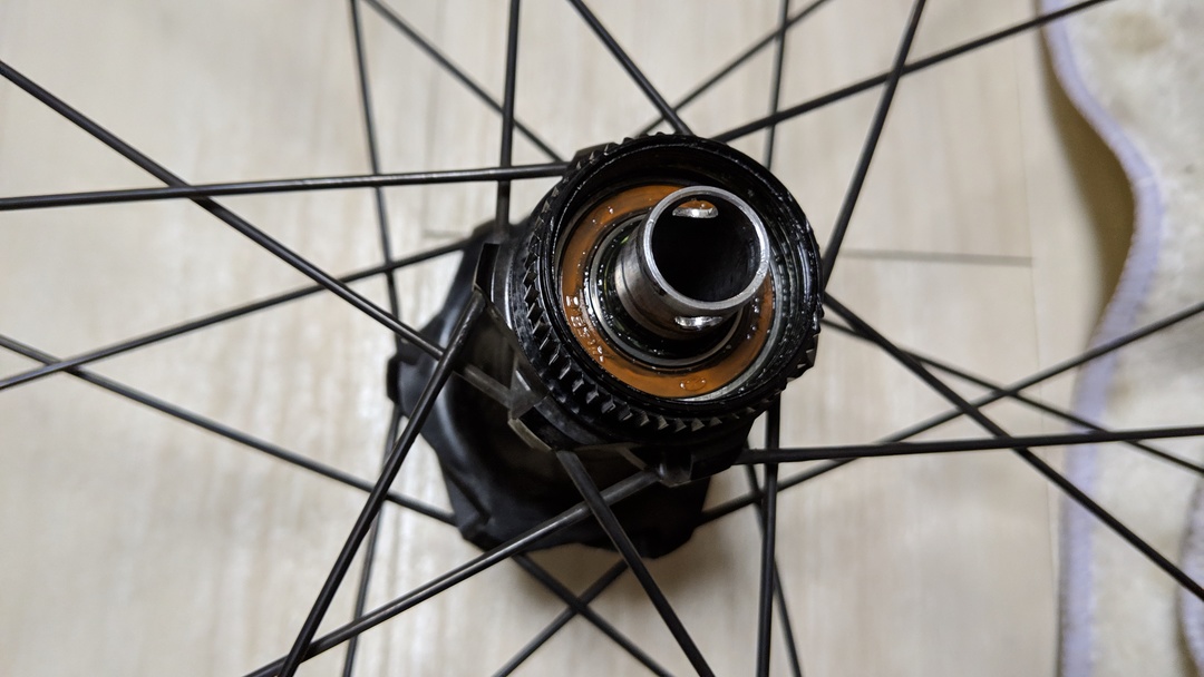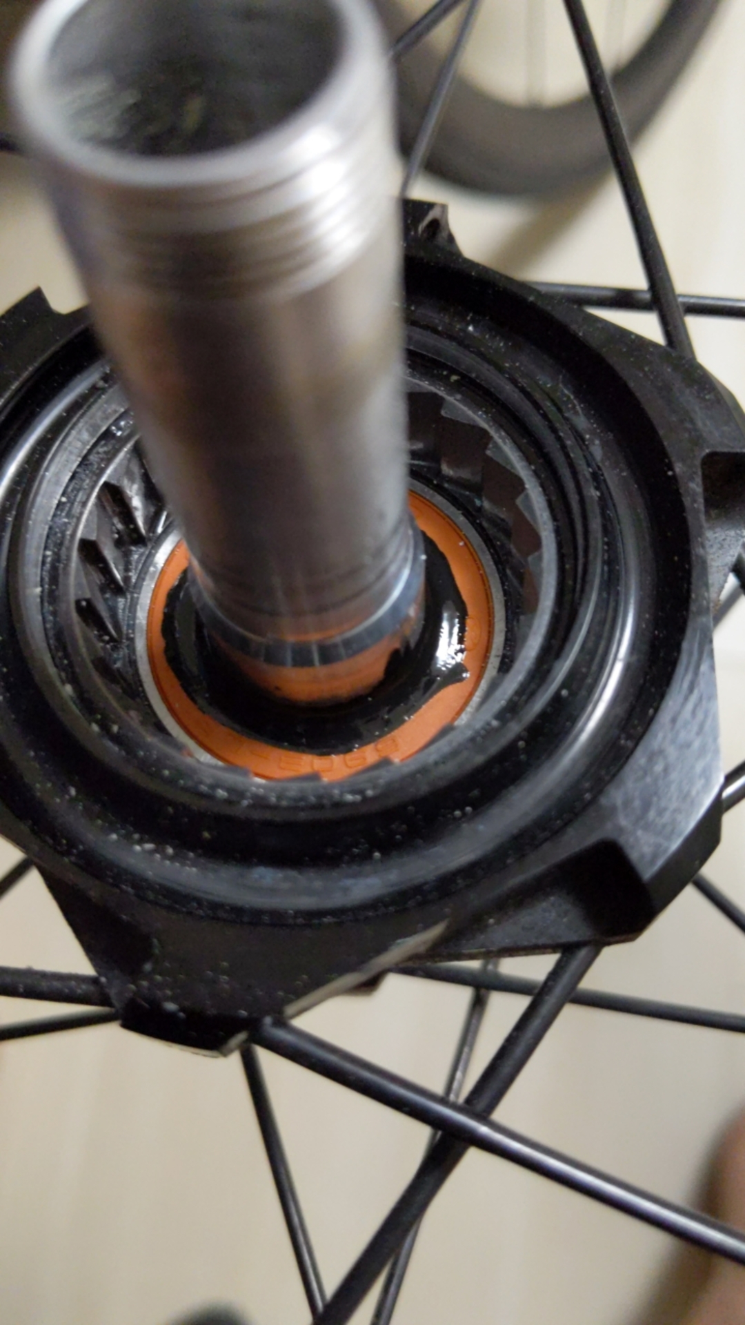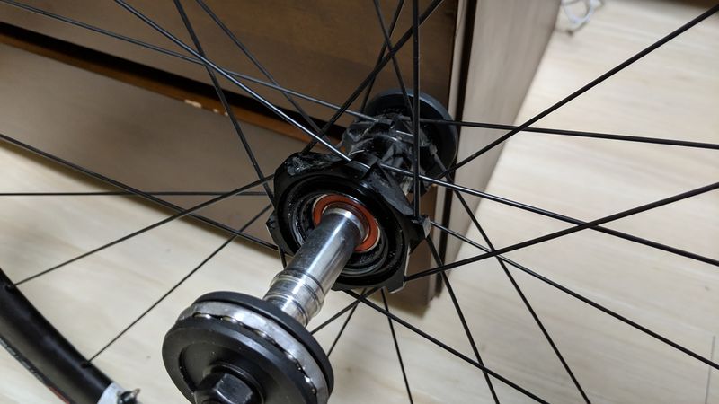 嵌めるときも、BBツールと適当なスペーサー・元々入っていたベアリングを駆使してしっかり奥まで圧入。フリー側はハブグリス、反フリー側はデュラグリスで防水してキャップ類を締めて作業完了。別物のようにヌルヌル動くようになった!