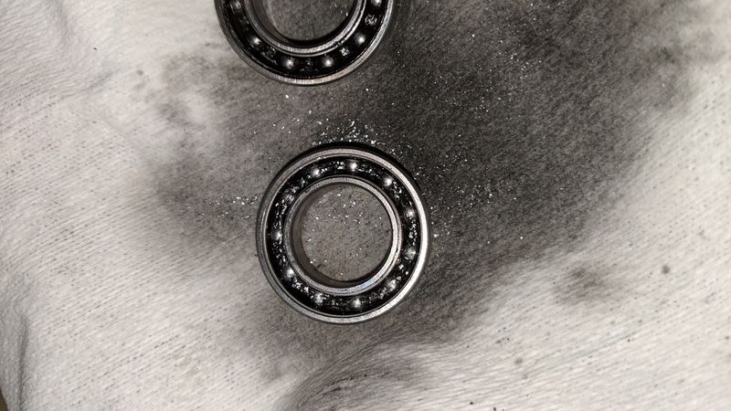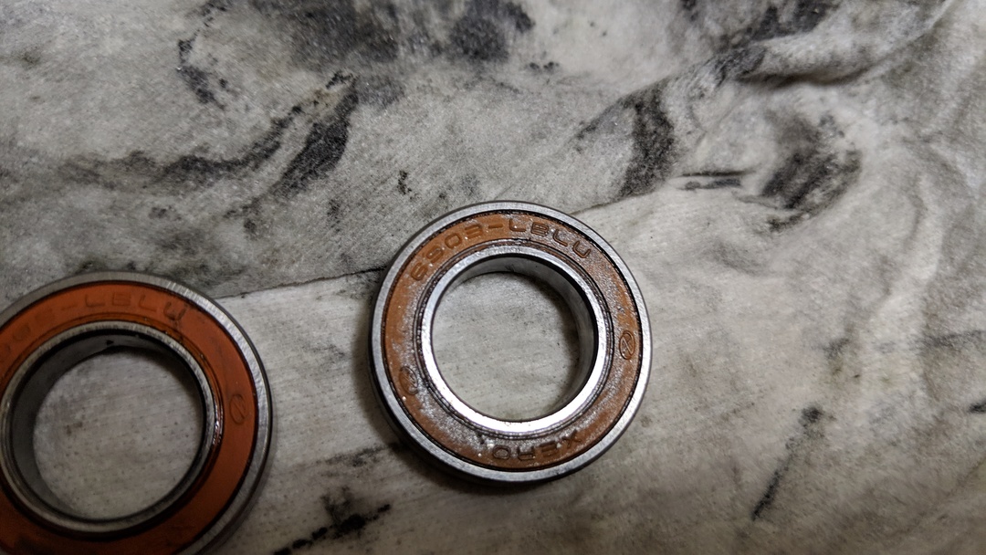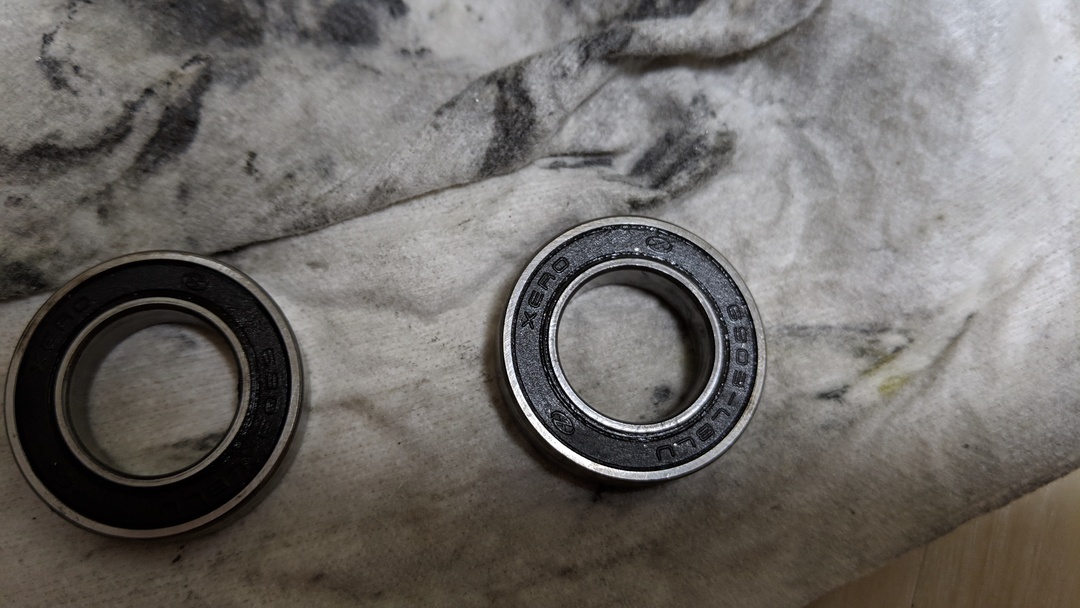 この手のシールドベアリングは接触型と非接触型のものがあり、後者のほうが抵抗が少ない。しかし、ロードバイクはメンテナンス頻度も少ないため接触型の防水性が高いもの…6903LLUをチョイス。