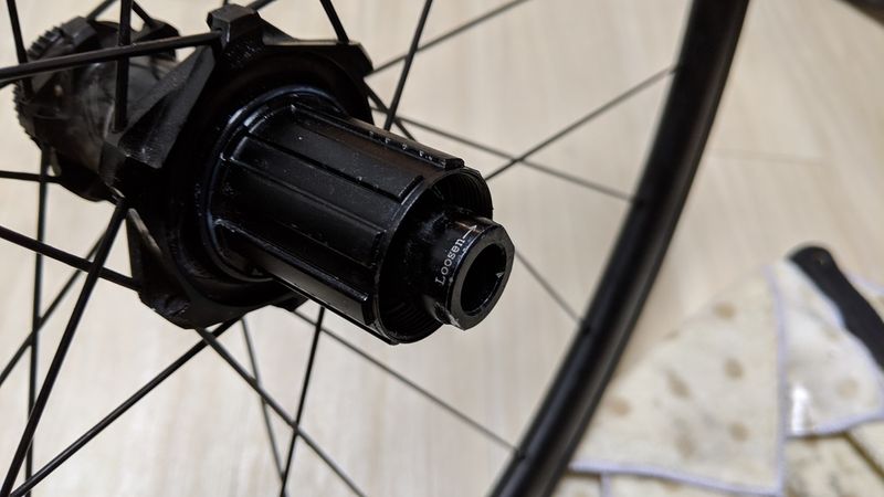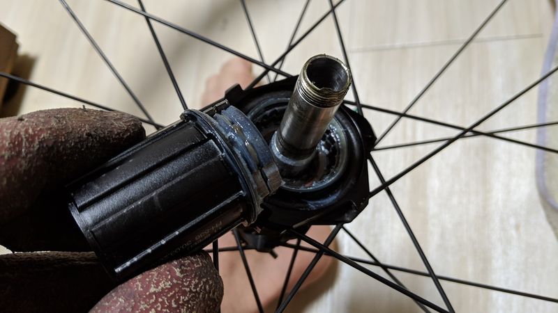 洗ってもすぐに墨汁が滲んでくるひどい状態。シャフトに穴が空いており、ここに細い棒を通せば固定できる。そしてドライブ側は逆ネジのキャップとなっているので、六角レンチをノンドライブ側の穴に通してハブレンチでクルクルと回せばすぐに外れた。最初に間違えて順ネジの緩め方をしたせいで六角レンチが曲げてしまい悲しい。