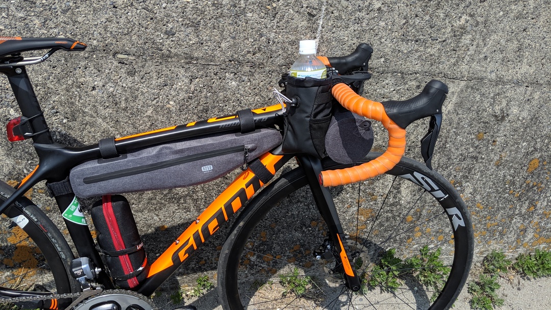 ダウンチューブ側のボトルケージを下にずらせば、ロングボトル1本運用も可能な範囲に見える。