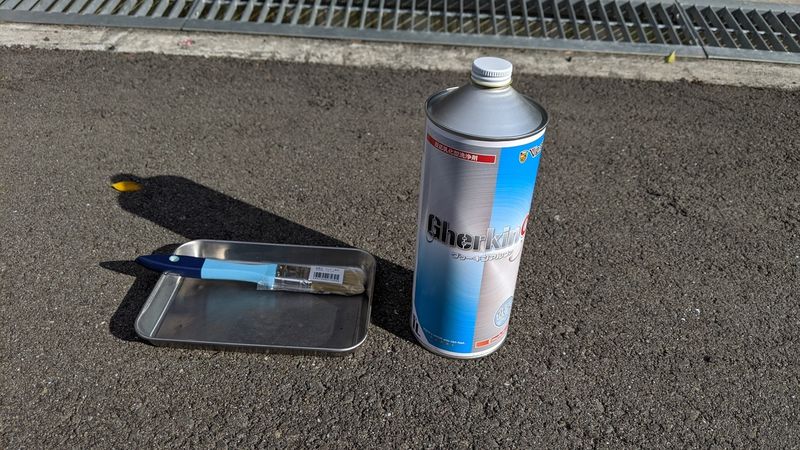 少量で効果があるとのことなので、必要な分のみをトレイに出して刷毛で塗っていきます。刷毛はホームセンターの塗料コーナーで良さげなコシと長さの物を買いました。