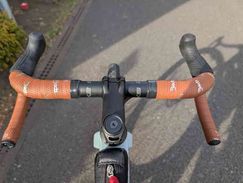 単体で感じていたほどのフレア具合は見た目から消えたものの、下ハンドルと上ハンドルで肘の曲がる向きは明確に変わり、当初の目的に対して期待が持てる。